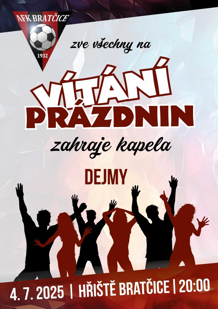 AFK Bratčice Vás zve na 12. ročník Vítání prázdnin, který proběhne netradičně v pátek 4. července od 20:00 hodin v Bratčicích na hřišti AFK.